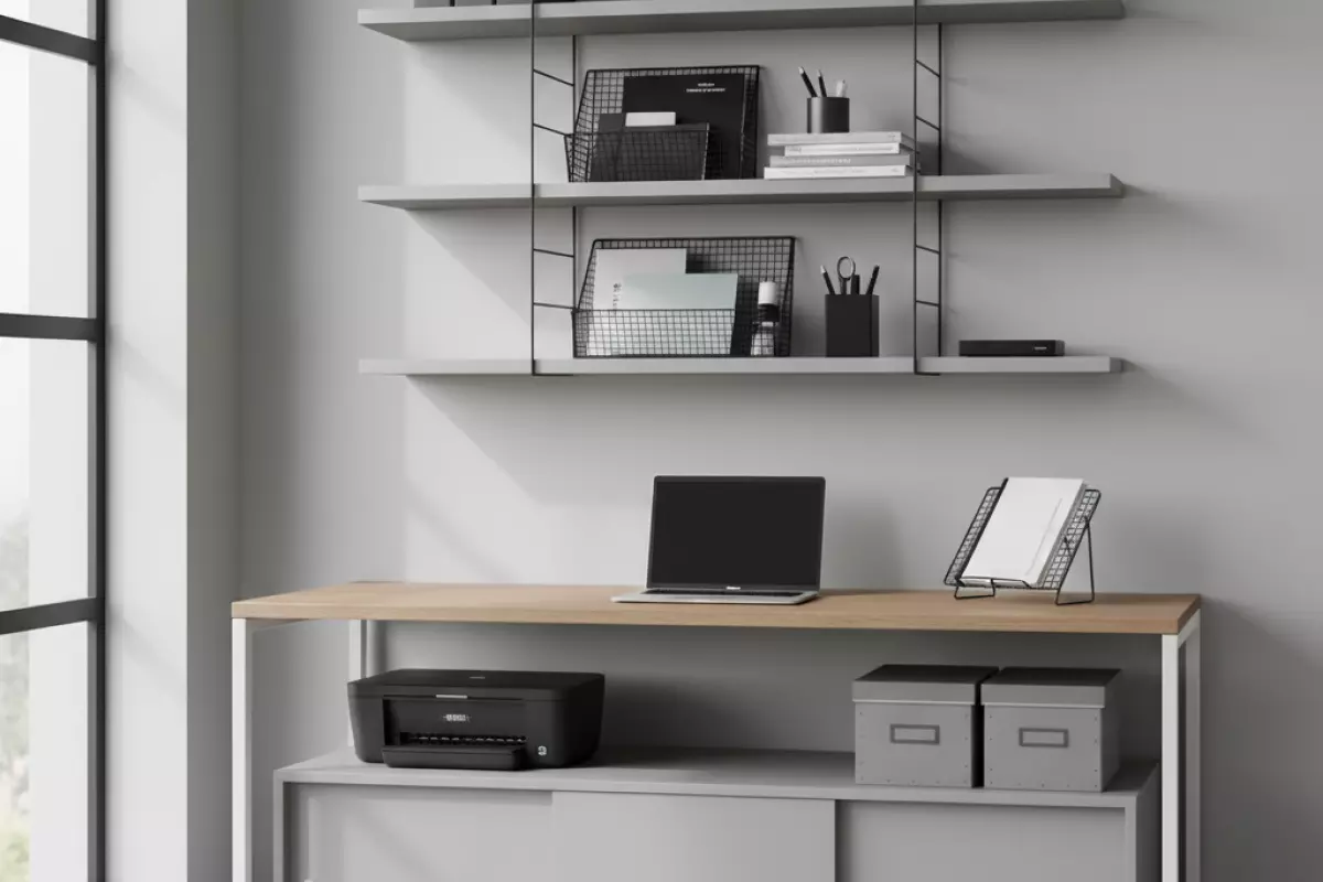 Стеллаж хорош там, где много разнородного: документы, расходники, книги, коробки. Работает правило: одинаковые по формату вещи — на одной полке, а «текучка» — ближе к рабочему месту. Если в комнате есть принтер, ему удобнее отдельная полка на высоте пояса: и бумагу проще менять, и кабели можно аккуратно увести назад.