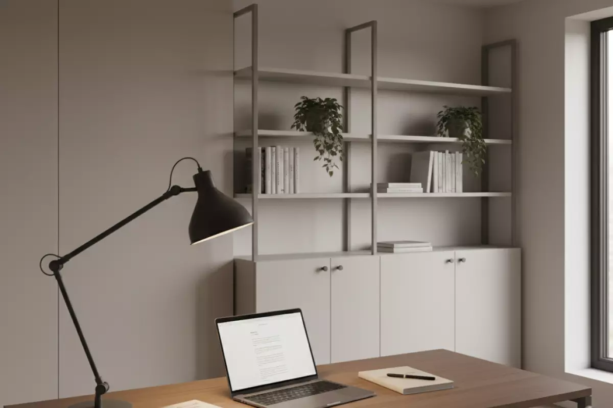 - Тяжёлые предметы (бумага, техника, архив) лучше уводить ниже уровня глаз: так и безопаснее, и «давление» на пространство меньше.
