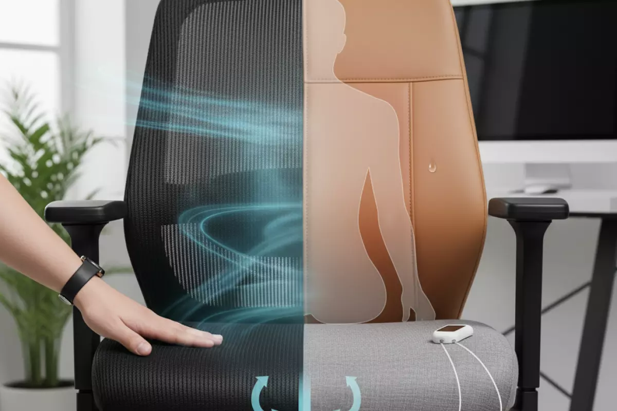 - Материал обивки — сетка лучше отводит тепло, ткань приятнее на ощупь, экокожа проще в уходе, но может быть жаркой.