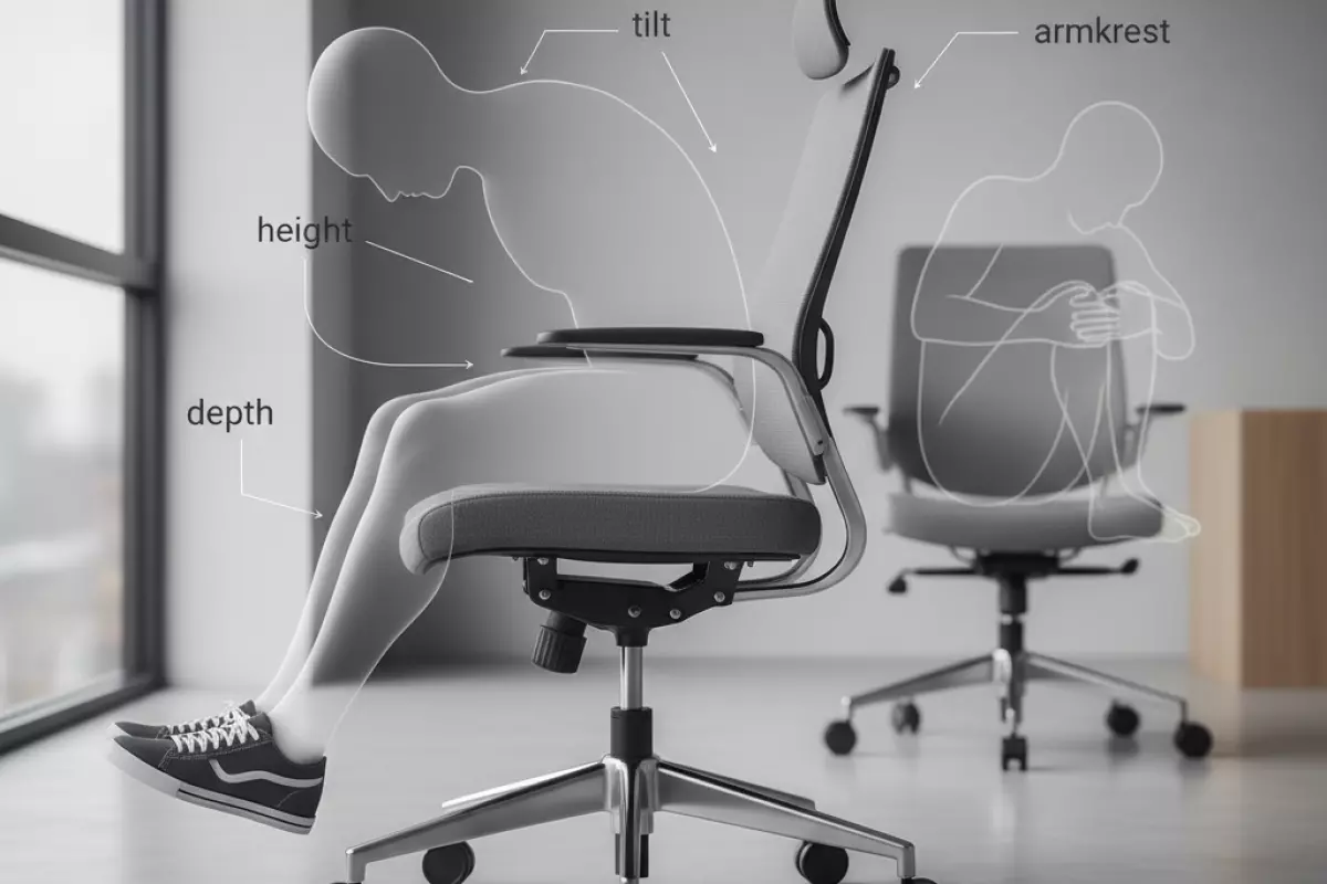 Начни с настройки посадки: когда ты сидишь, стопы должны уверенно стоять на полу, колени — примерно под углом 90°, а таз — не «скатываться» назад. Если стул заставляет сутулиться, чаще всего проблема в высоте сиденья, глубине и отсутствии опоры для поясницы — это можно скорректировать простыми подручными решениями.