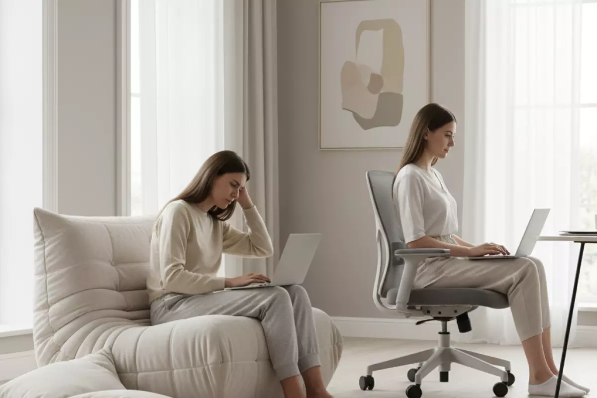 Проблема в том, что мягкие материалы съедают ощущение границ. Вы перестаёте чувствовать, где заканчивается сиденье, где должна быть поддержка под поясницей, и начинаете компенсировать это мышцами: напрягать шею, поджимать ноги, упираться локтями в стол. Это не «расслабление», а скрытая работа, которая утомляет и портит посадку.