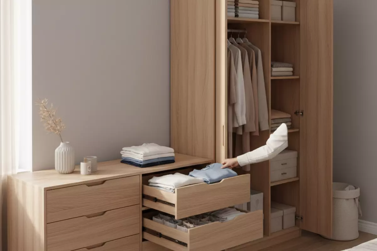 Комод выигрывает там, где важны быстрый доступ и понятная организация вещей: открыл ящик — сразу видно содержимое, не нужно раздвигать плечики и «нырять» в глубину. В спальне это особенно заметно, когда вы каждый день берёте одни и те же предметы — бельё, футболки, домашнюю одежду, аксессуары.