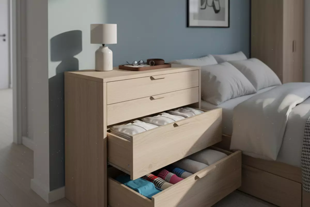 | Хранить домашнюю одежду рядом с кроватью | Не нужно идти к большому шкафу и открывать дверцы | Проверьте, чтобы ящики выдвигались полностью и не упирались в мебель |