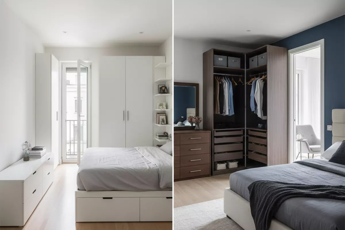 Хороший ориентир — сначала «зафиксировать» кровать и проходы, а уже потом подбирать формат хранения. Тогда выбор между комодом и шкафом будет не про «что моднее», а про то, что реально удобно именно в ваших метрах.