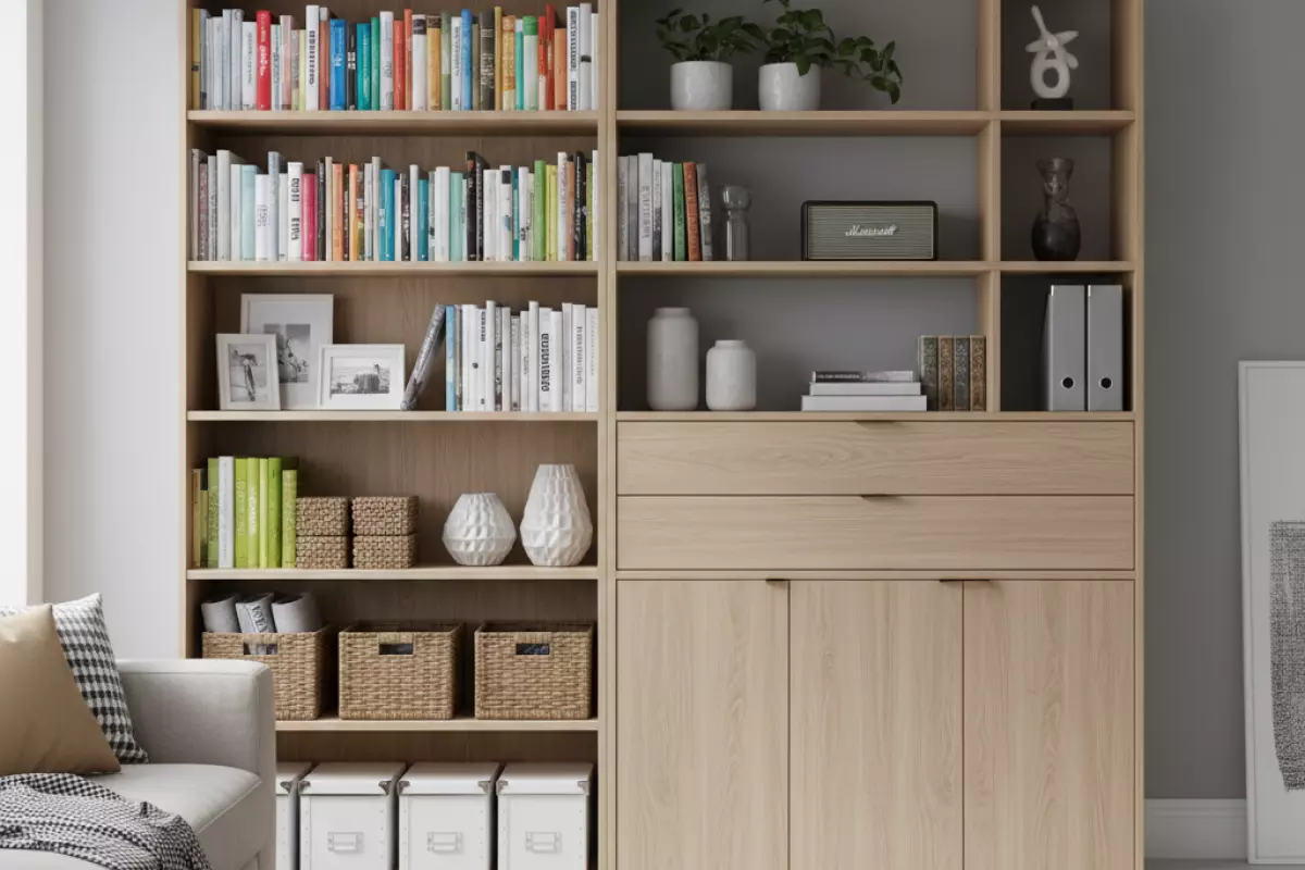 - Смешанное хранение: сверху — книги/декор, снизу — закрытые секции для бытовых мелочей.