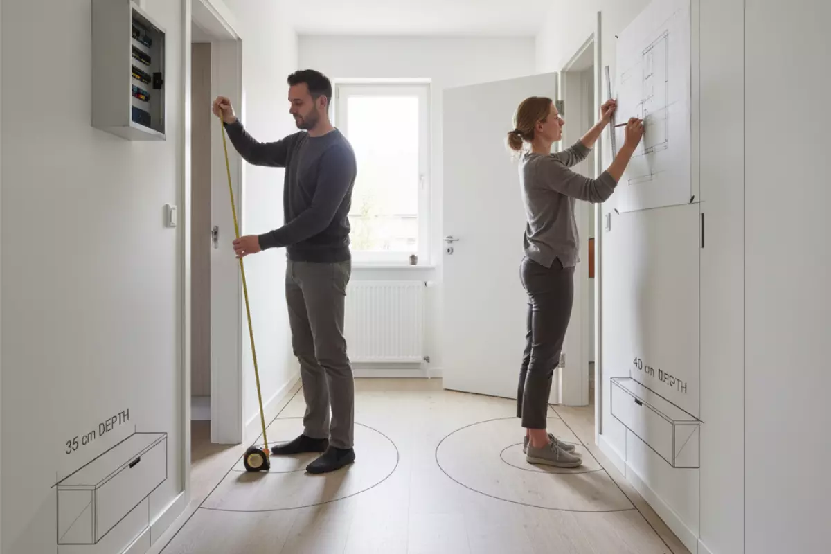 Сначала снимите реальные габариты: длину и ширину, высоту до потолка, а также «рабочие» зоны — где открывается входная дверь, куда распахиваются межкомнатные, где проходит батарея и выступают щитки. В прихожих важнее не общая площадь, а свободный проход: лучше заранее отметить на плане коридор движения и под него подбирать глубину шкафов и тумб.