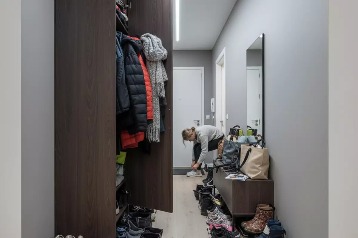 Летом появляются кепки и легкая обувь, зимой — объемные пуховики и сапоги. В узком коридоре особенно заметно, что хранение должно быть гибким: часть вещей нужна ежедневно, часть — раз в неделю, остальное лучше убирать повыше или подальше.
