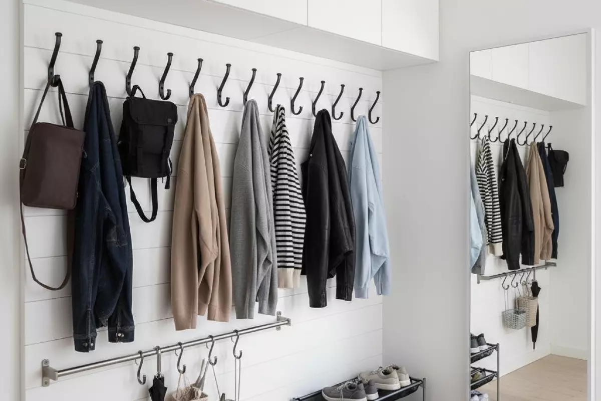 Чтобы вещи не пахли сыростью, оставляйте место для циркуляции воздуха и не вешайте мокрые куртки вплотную. Если места мало, выделите один «дежурный» крючок для подсушивания и меняйте его по мере необходимости.