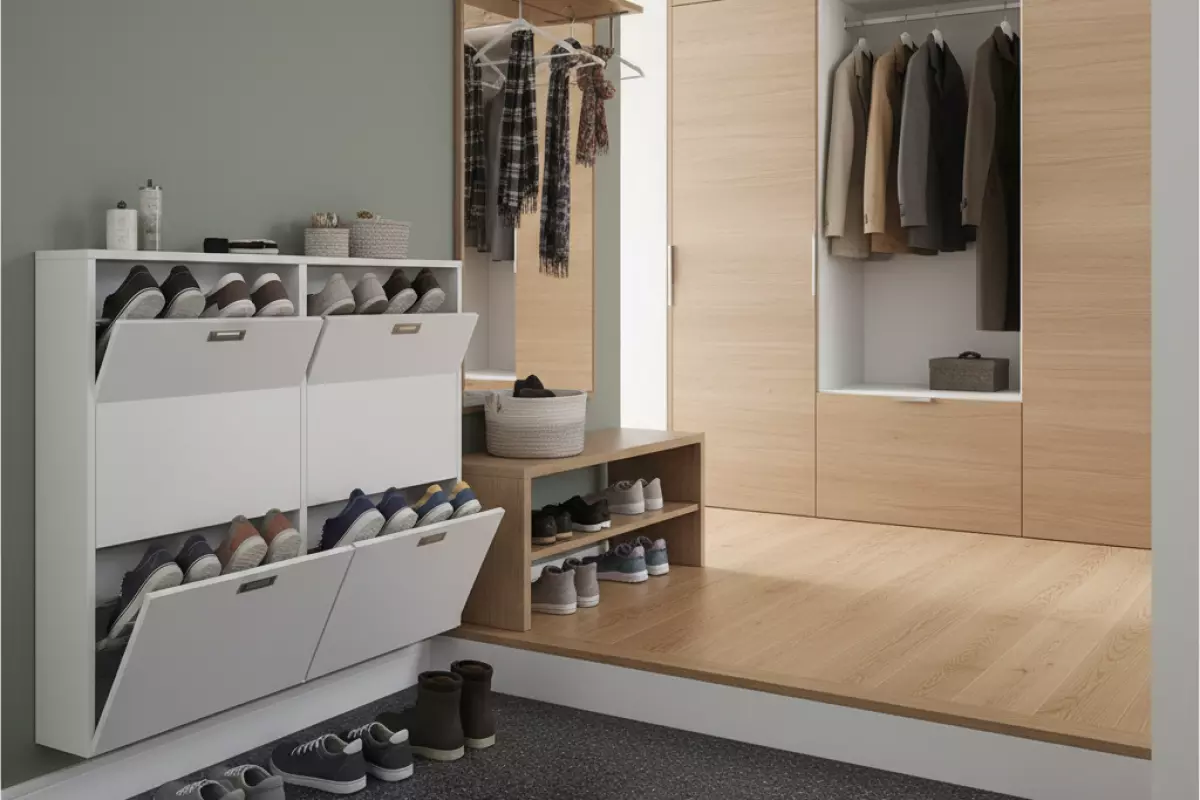 - Зазор 3–5 см между стеной и обувным модулем — помогает проветриванию и облегчает уборку.