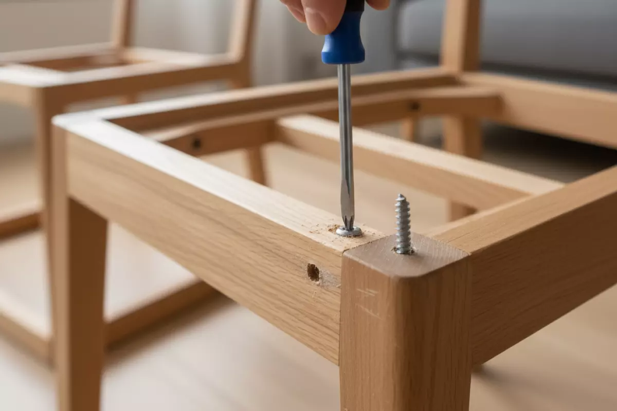 Самый типичный сценарий — винты, саморезы, конфирматы или болты со временем теряют натяг. От микродвижений появляются трение и характерный писк, особенно при нагрузке (когда садитесь на стул, открываете дверцу, двигаете диван).