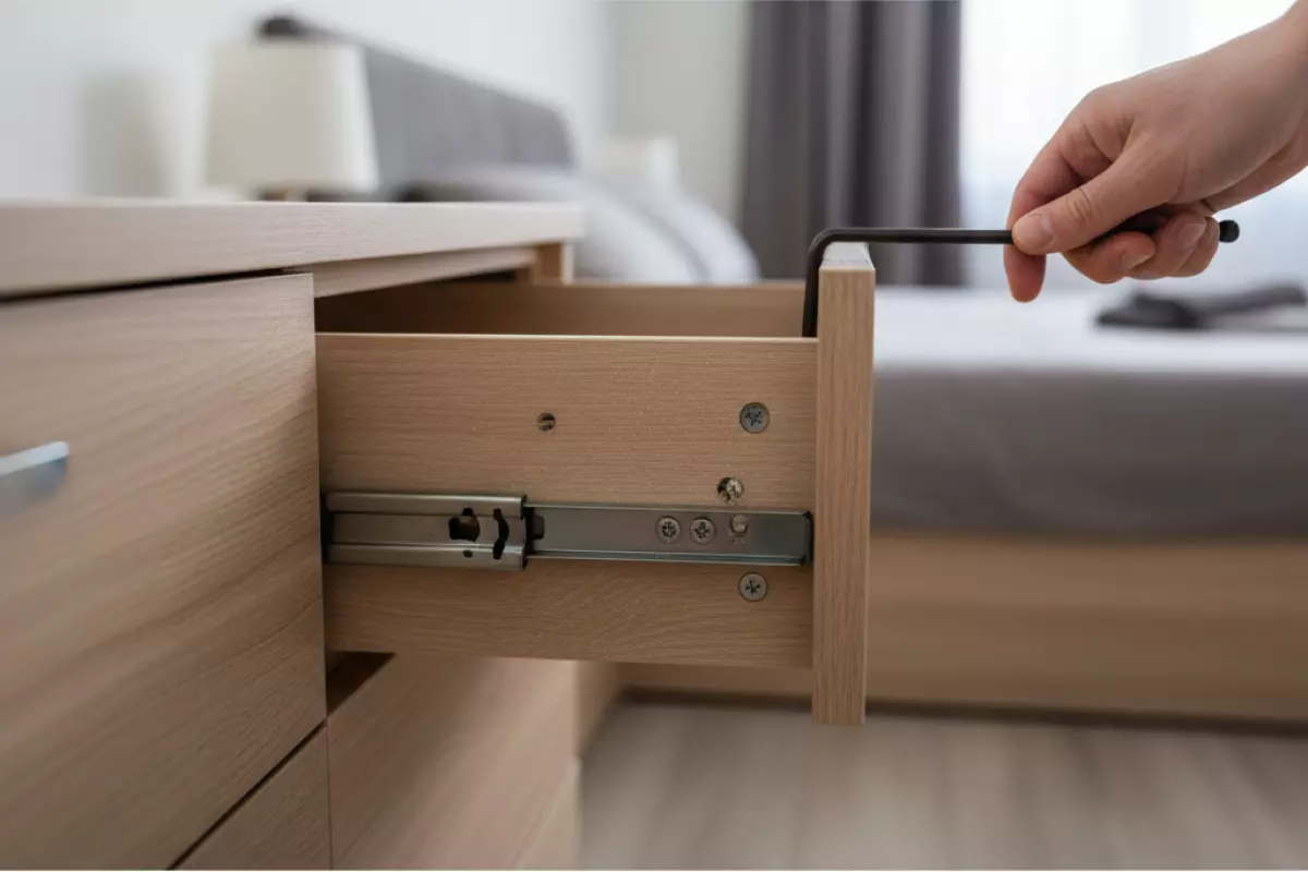 | Направляющие ящиков | Пыль, износ роликов/шариков, перекос | Комоды, тумбы, кухни | Рывки при движении, разная высота зазоров слева/справа |