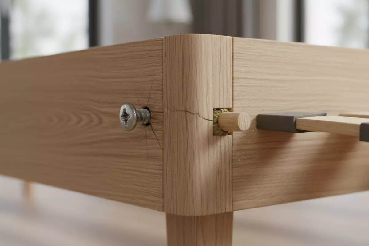 | Угловые стяжки, конфирматы, саморезы | Ослабление натяга, люфт в отверстии | Корпусная мебель, кровати | Шатается ли узел, есть ли «ход» при нажатии |
