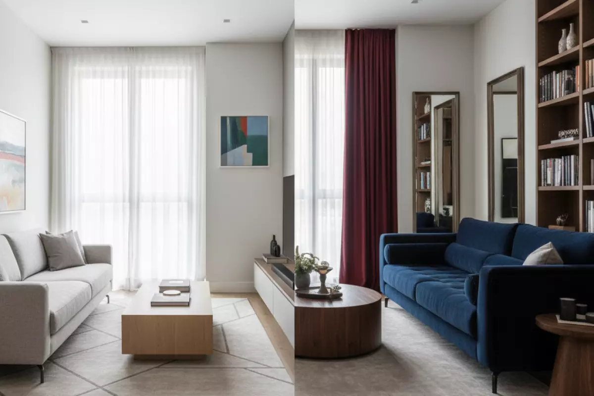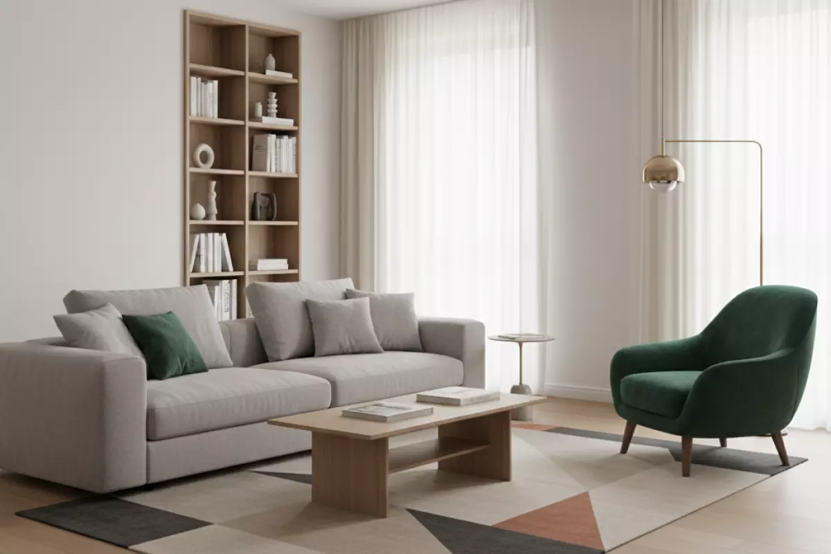 | Разный масштаб: миниатюрный столик рядом с массивным диваном | Нарушены пропорции, предметы выглядят случайными | Подобрать более «весомый» по размеру объект или компенсировать крупным ковром/торшером |
