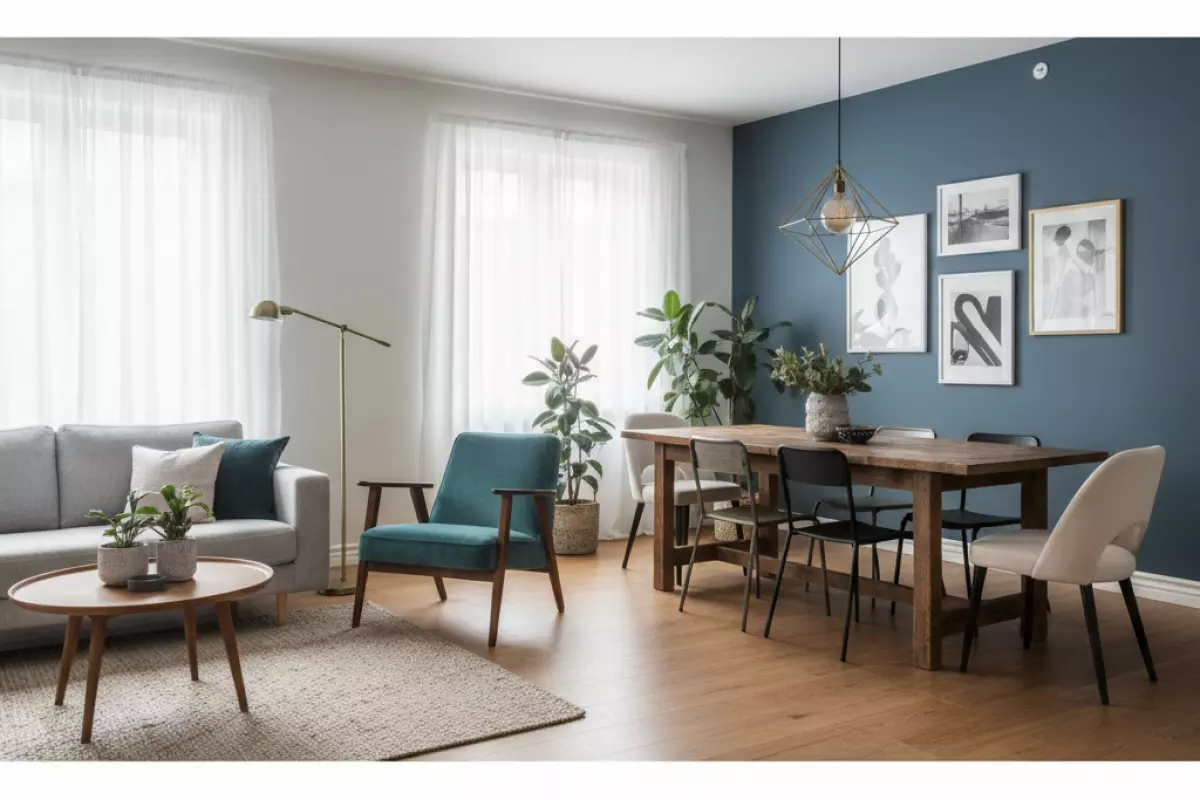 Если сомневаетесь между двумя направлениями, выберите одно как основное (примерно 70–80% крупных предметов), а второе оставьте для деталей: светильников, стульев, небольших столиков, текстиля. Так мебель будет выглядеть цельно, даже если интерьер не «по учебнику».