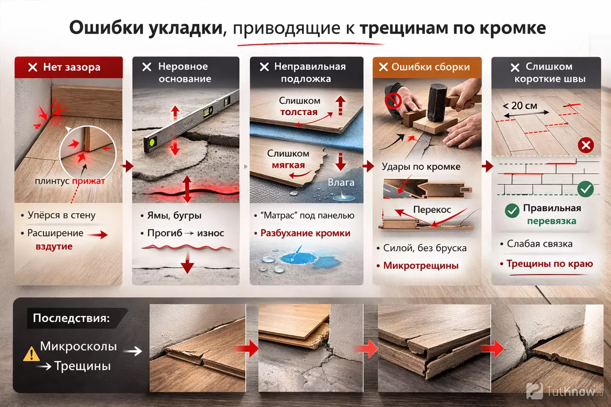 Когда торцевые стыки в соседних рядах расположены близко, нагрузка концентрируется на небольшой зоне. При ходьбе и особенно под мебелью короткие торцы начинают расходиться, а кромка — трескаться.