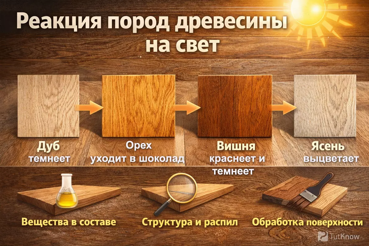 | Порода древесины | Разная чувствительность из-за состава экстрактивных веществ | У одних пород быстрее меняется оттенок, у других — контраст текстуры | Дубильные вещества, смолы, природные масла, плотность |