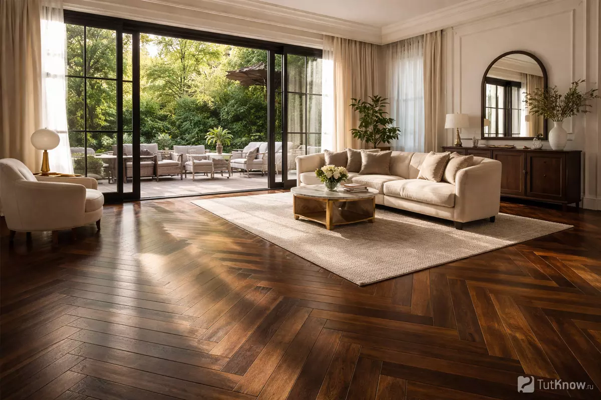 | Полиуретановый лак (в т.ч. двухкомпонентный) | Плотная плёнка частично экранирует свет, добавки повышают стойкость | Высокая износостойкость, хорошо переносит частую уборку | Локальный ремонт заметнее; при ошибках нанесения возможны «переливы» глянца | Коридоры, кухни-гостиные, зоны активного хождения |