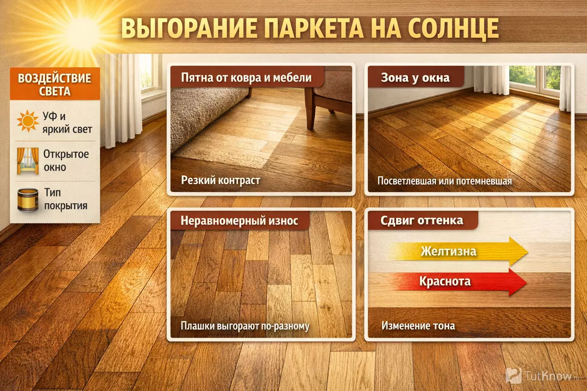 - Цвет и тон — появляются зоны разной насыщенности: у окна светлее/темнее, под ковром — «старый» оттенок.