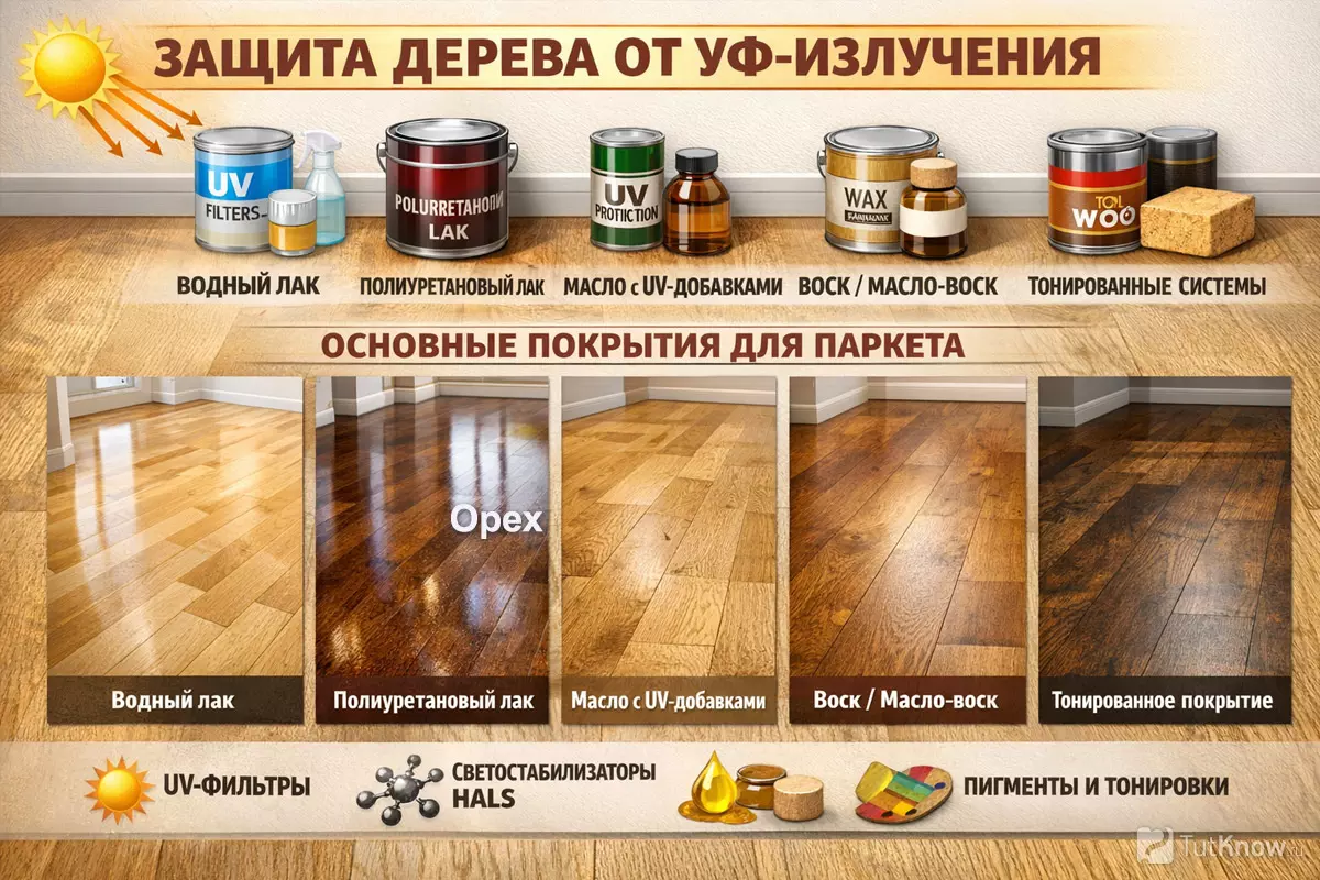 Финишный слой не отменяет фотостарение, но сильно влияет на скорость и характер изменений. Одни составы лучше фильтруют УФ, другие сами желтеют или мутнеют. Плюс важно, что «защита от солнца» и «защита от истирания» — не одно и то же: покрытие может быть прочным, но слабым именно к свету.
