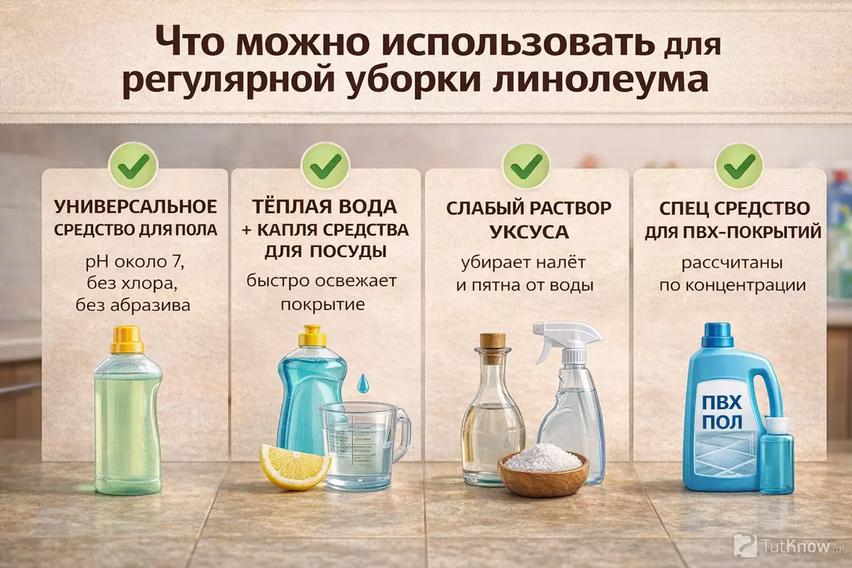 Для регулярной уборки линолеума лучше всего подходят мягкие составы с нейтральным pH: они снимают грязь, но не разъедают защитный слой и не оставляют липкости. В быту это обычно «универсальные» средства для полов без агрессивных добавок, а также простые домашние растворы в слабой концентрации.