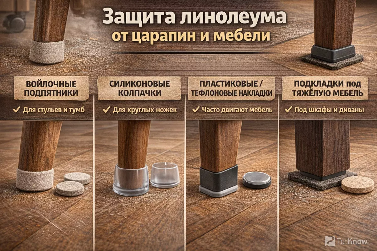 - Подкладки под тяжёлую мебель (пластины/пятаки) — распределяют нагрузку и уменьшают риск вмятин от шкафа или дивана.