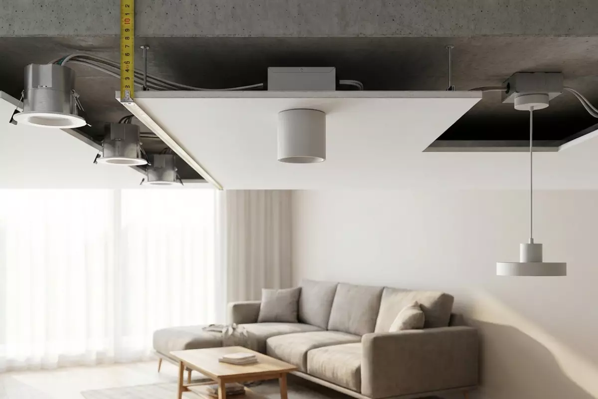 Потеря высоты почти всегда складывается из трёх вещей: толщины самой системы (каркас + облицовка), зазора до базового перекрытия (чтобы выровнять плоскость) и места под коммуникации. Поэтому «минус 5 см» бывает только в идеальных условиях: ровная плита, нет проводки/вентиляции, не нужны встраиваемые светильники.