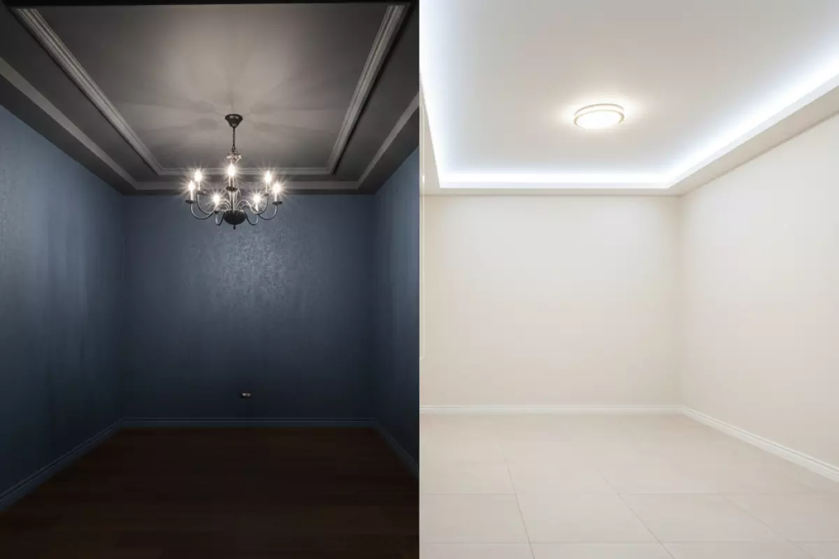 - Тени по периметру. Перепады высоты почти всегда дают тёмные полосы в углах и на стыках. Эти тени визуально «опускают» верх и делают комнату коробочкой.