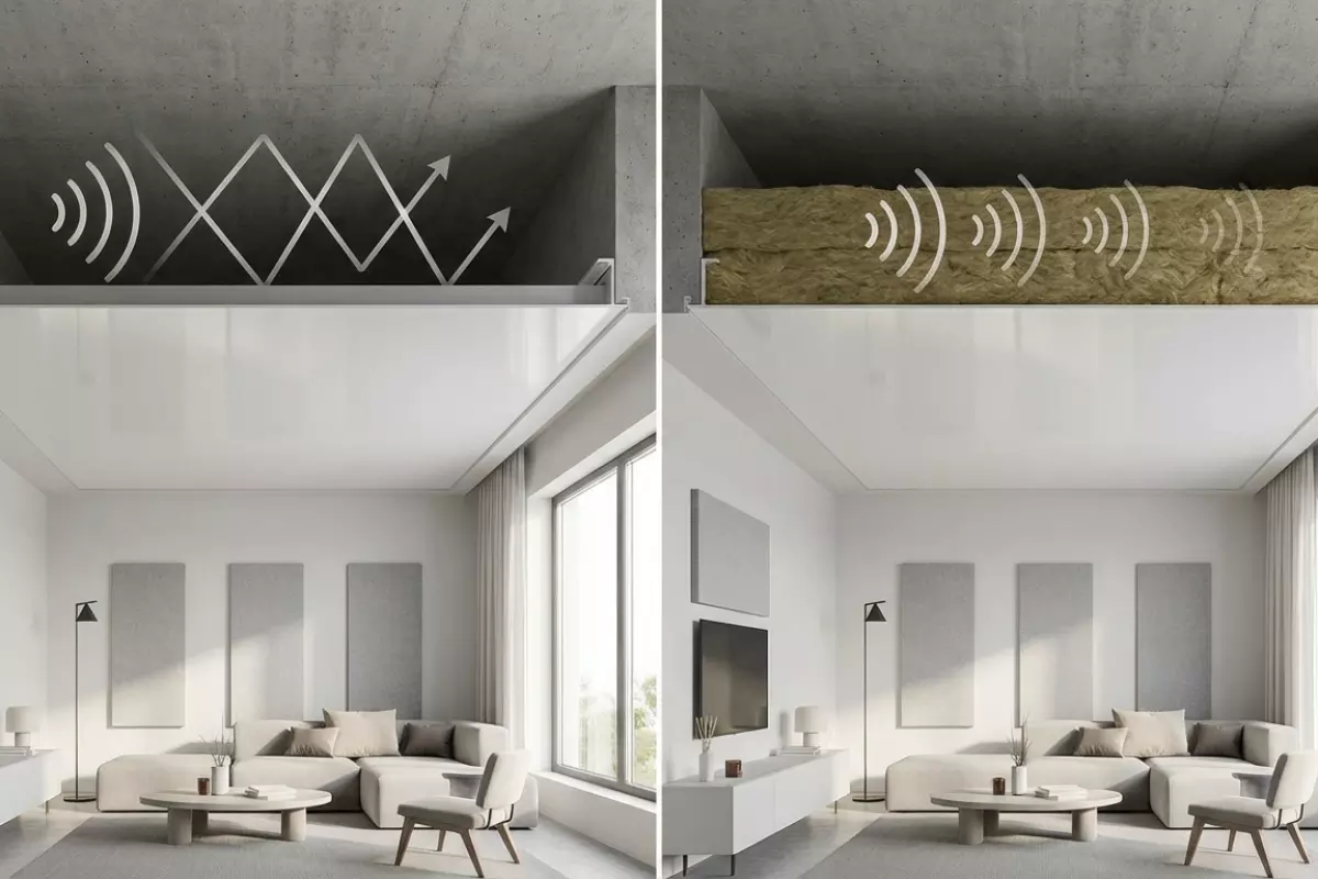 После монтажа натяжного полотна над ним остаётся прослойка воздуха. Если её оставить «как есть», она работает как дополнительная акустическая камера: часть звука отражается от базового перекрытия, часть — от полотна, а между ними возникают переотражения. Когда же в запотолочной зоне появляется утеплитель (или другой волокнистый материал), характер отражений меняется: высокие и средние частоты сильнее «гаснут», а общая «звонкость» комнаты обычно снижается.