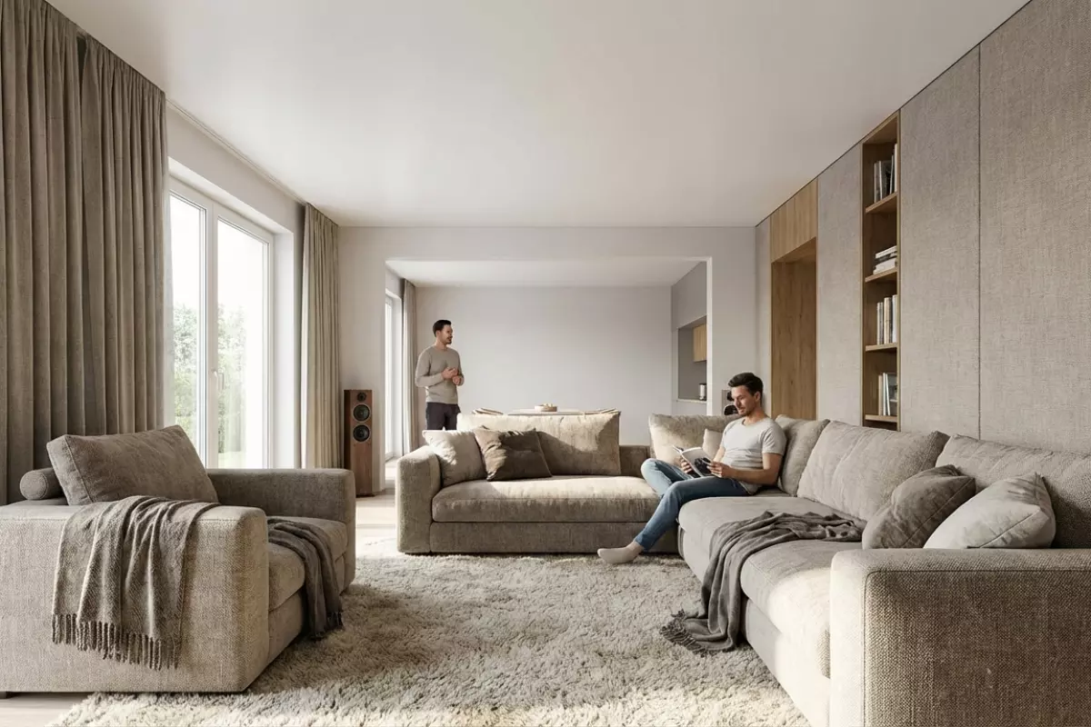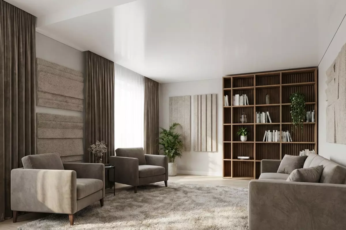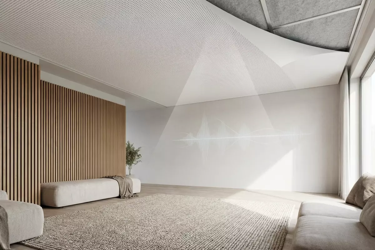 В реальной комнате звук «собирается» не одним элементом отделки, а суммой отражений и поглощения от разных поверхностей. Потолок важен, но часто он не главный «регулятор» разборчивости речи и ощущения эха: мягкая мебель, шторы, ковры и фактура стен нередко влияют заметнее, потому что находятся ближе к источникам и слушателям и работают на уровне первых отражений.