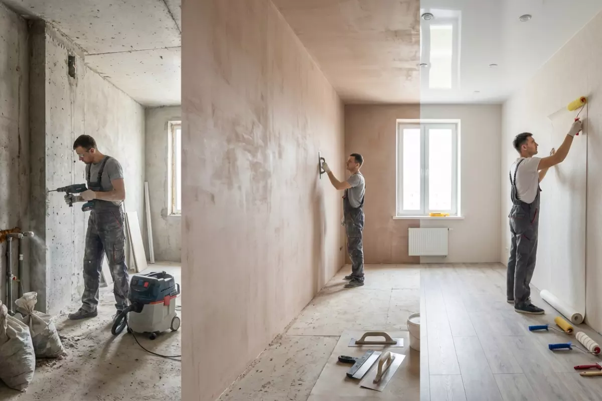 | Демонтаж | Снимают старые покрытия, освобождают помещение | Легче оценить состояние основания и объём работ | Мусор и пыль могут испортить уже готовую отделку |
