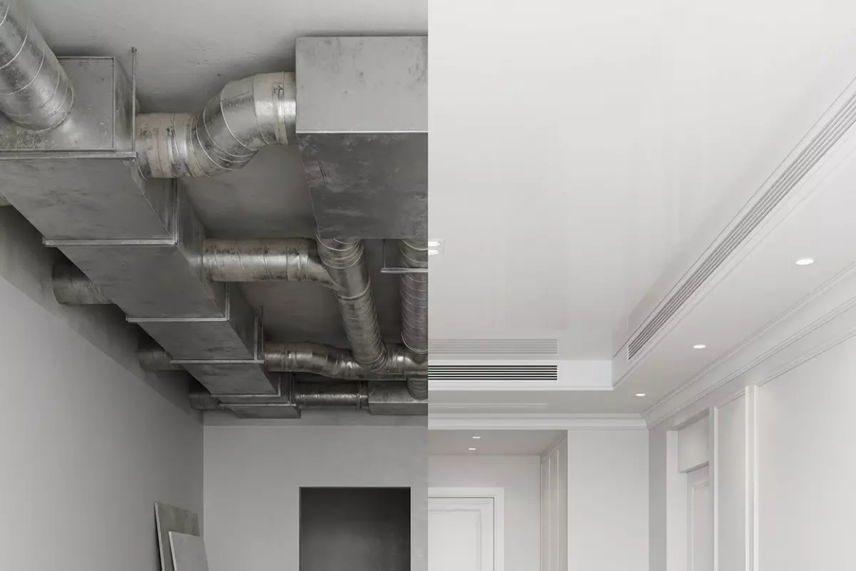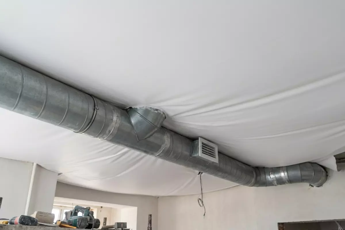 - Слишком маленький зазор до базового перекрытия. Воздуховод упирается в полотно или багет, появляются заломы, вибрации и заметные «волны» на потолке.