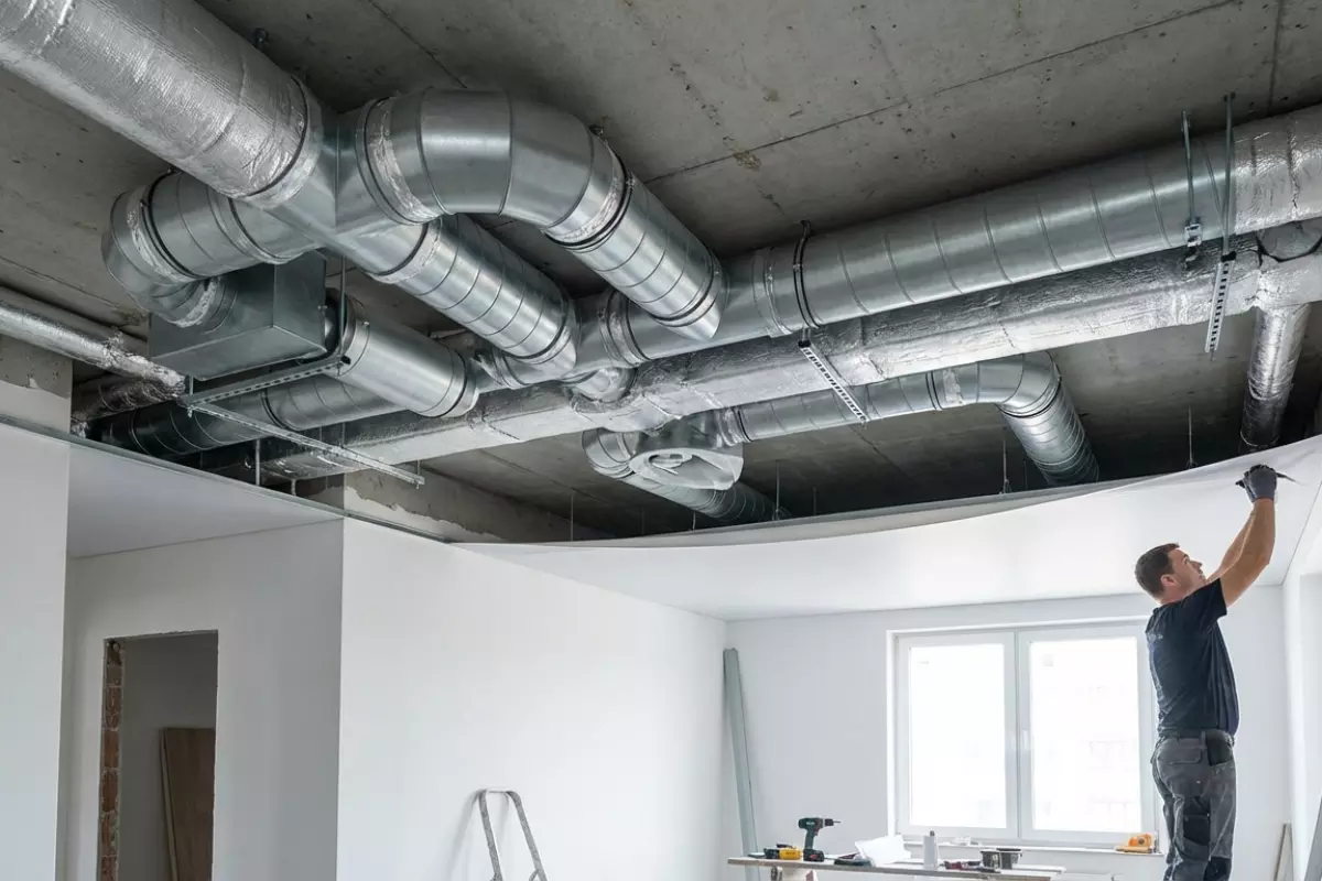Под натяжным полотном обычно прячут не только сами воздуховоды, но и часть «обвязки» — то, что портит вид или мешает чистой геометрии потолка. Важно понимать: скрывают именно то, что не требует постоянного доступа и не нарушает работу системы по тяге, шуму и обслуживанию.