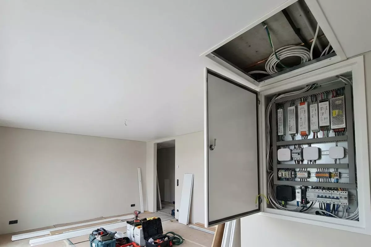 - Вынос оборудования в шкаф/щит. Если есть возможность, переносите «мозги» и питание в слаботочный щит или шкаф: над потолком оставляйте только то, что физически должно быть там (например, соединение светильников).