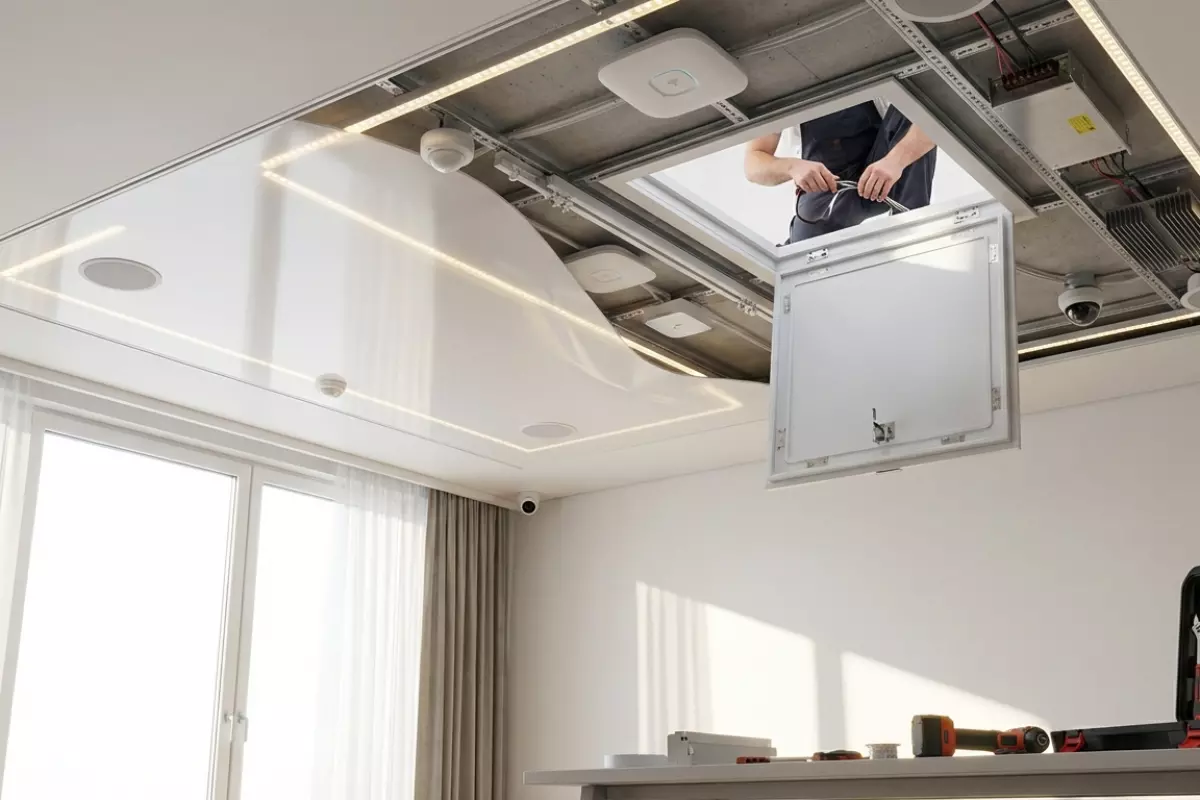 - Продумайте доступ к Wi‑Fi/mesh-точкам. Если точка спрятана над полотном, заранее решите, как к ней добраться для перезагрузки и замены.