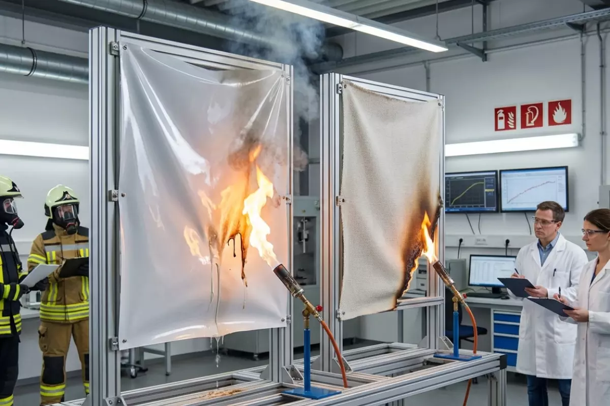 - Тканевые полотна (полиэстер с пропиткой) могут показывать хорошие результаты по воспламеняемости, но по дыму и токсичности картина бывает разной — проверяйте полный набор показателей.