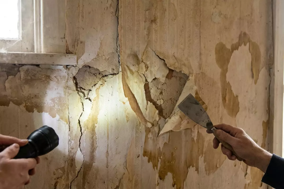 - Следы влаги — темные пятна, высолы, плесень, размягчение материала.