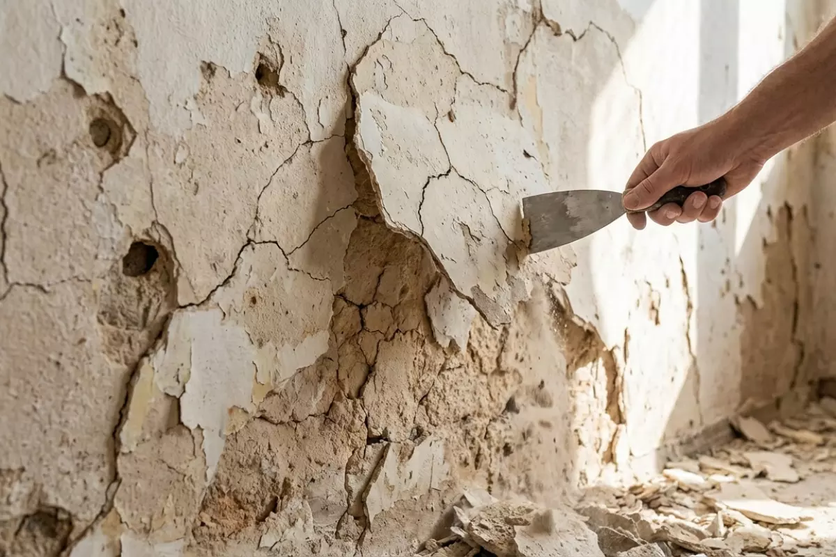 - Сыпучесть: штукатурка, шпаклёвка или краска мелят, остаются на ладони, осыпаются при лёгком царапании.