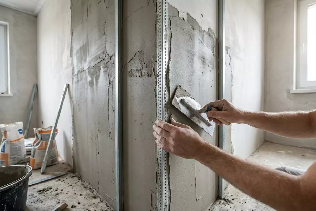 Угол «заваливается» по двум сценариям: плоскости стен сами по себе кривые (волны, перепады), либо плоскости ровные, но сходятся не там и не под тем градусом. От этого зависит метод: иногда достаточно вывести кромку, а иногда приходится тянуть обе стены заново.