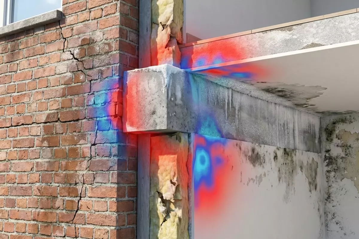 - Мостики холода — участки, где тепло уходит быстрее: железобетонные перемычки, армопояса, торцы плит, углы, примыкания балконов, откосы.