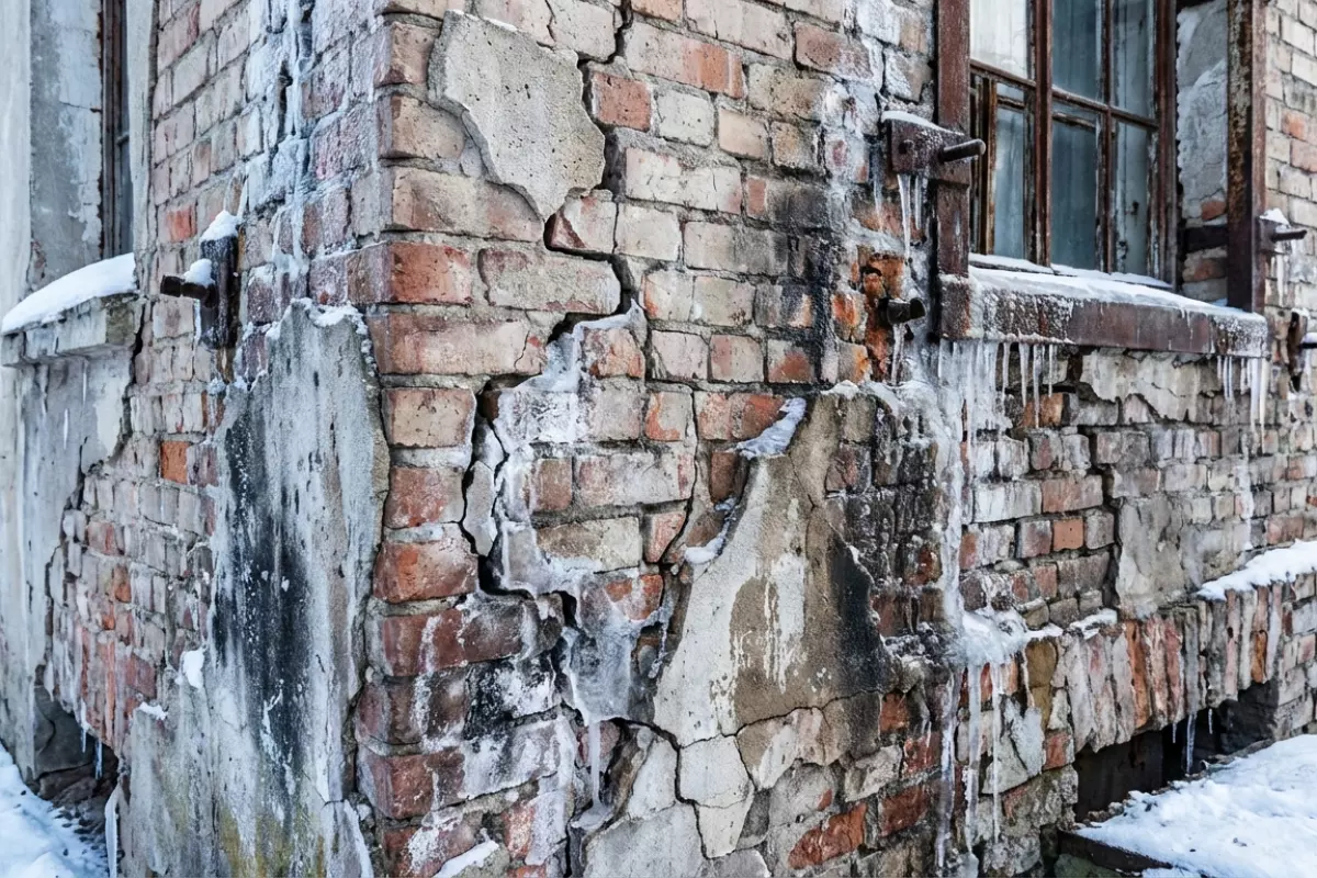 - Кирпич и блоки постепенно крошатся: мороз разрушает кромки, швы и лицевой слой, особенно при высокой влажности.