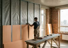Проверьте кривизну стены. В углах комнаты вверните длинные саморезы и натяните через них нитку по диагоналям стены и по периметру комнаты. Установите нити в вертикальную плоскость с помощью отвеса. Измерьте наименьшее расстояние между шнуром и стеной и переместите все нити на это расстояние в сторону стены, оставив зазор в пределах 5 мм. Проверьте углы комнаты специальными шаблонами или угловым правилом.