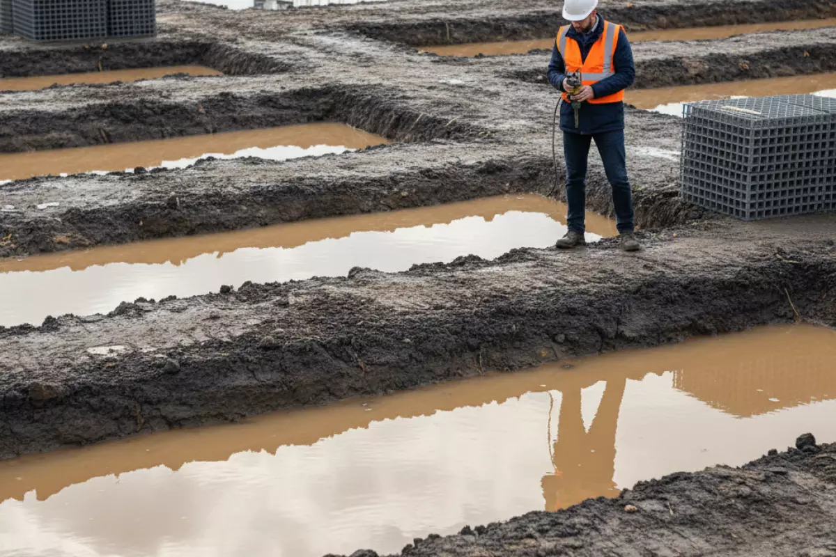 - Высокий уровень грунтовых вод и/или устойчивое переувлажнение участка (вода стоит в шурфах, долго не уходит после дождей).