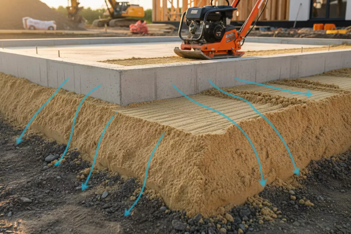 Песчаное основание обычно хорошо держит нагрузку, если материал плотный, чистый и не переувлажнён. На практике решают не «сам песок», а его состояние: крупность зёрен, степень уплотнения, влажность и то, насколько ровно распределяется давление от фундамента.