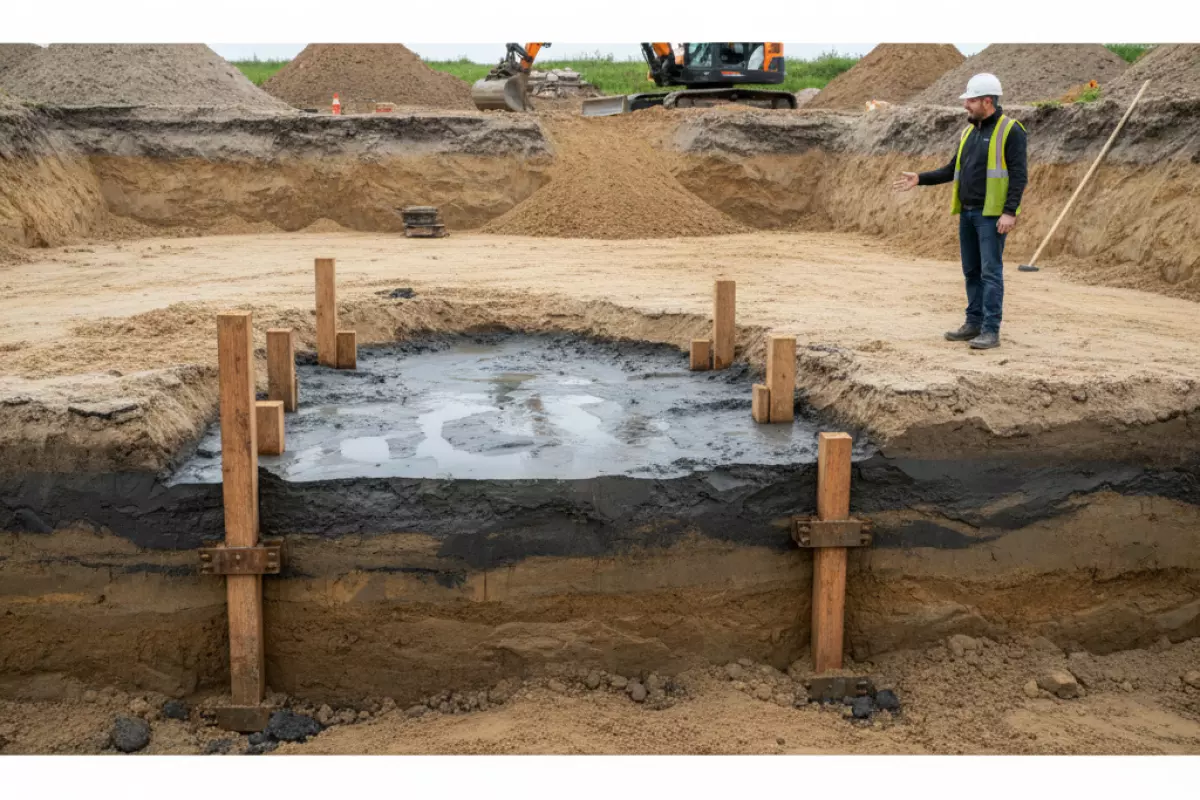 - Оставляют котлован открытым надолго. Дожди размывают откосы и меняют влажность основания; затем фундамент ставят уже на «другой» грунт.