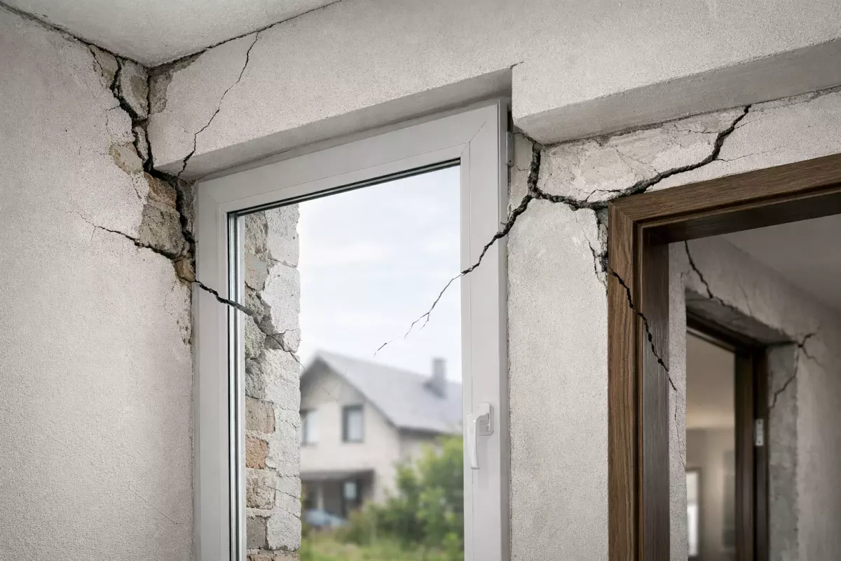 - Трещины на стенах и перегородках: диагональные от углов окон/дверей, «ступеньками» по швам кладки, либо вертикальные по углам здания.
