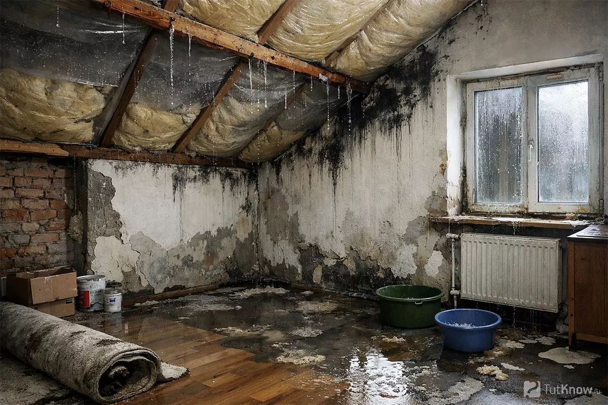 - Потеря тепла: мокрый утеплитель резко хуже держит температуру.