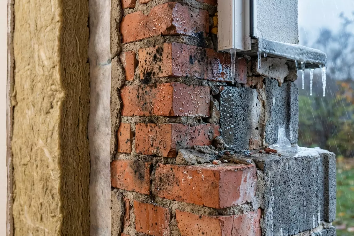 - Циклы «намокло–замёрзло» — вода в порах при морозе расширяется, что ускоряет растрескивание кирпича, газобетона и раствора.
