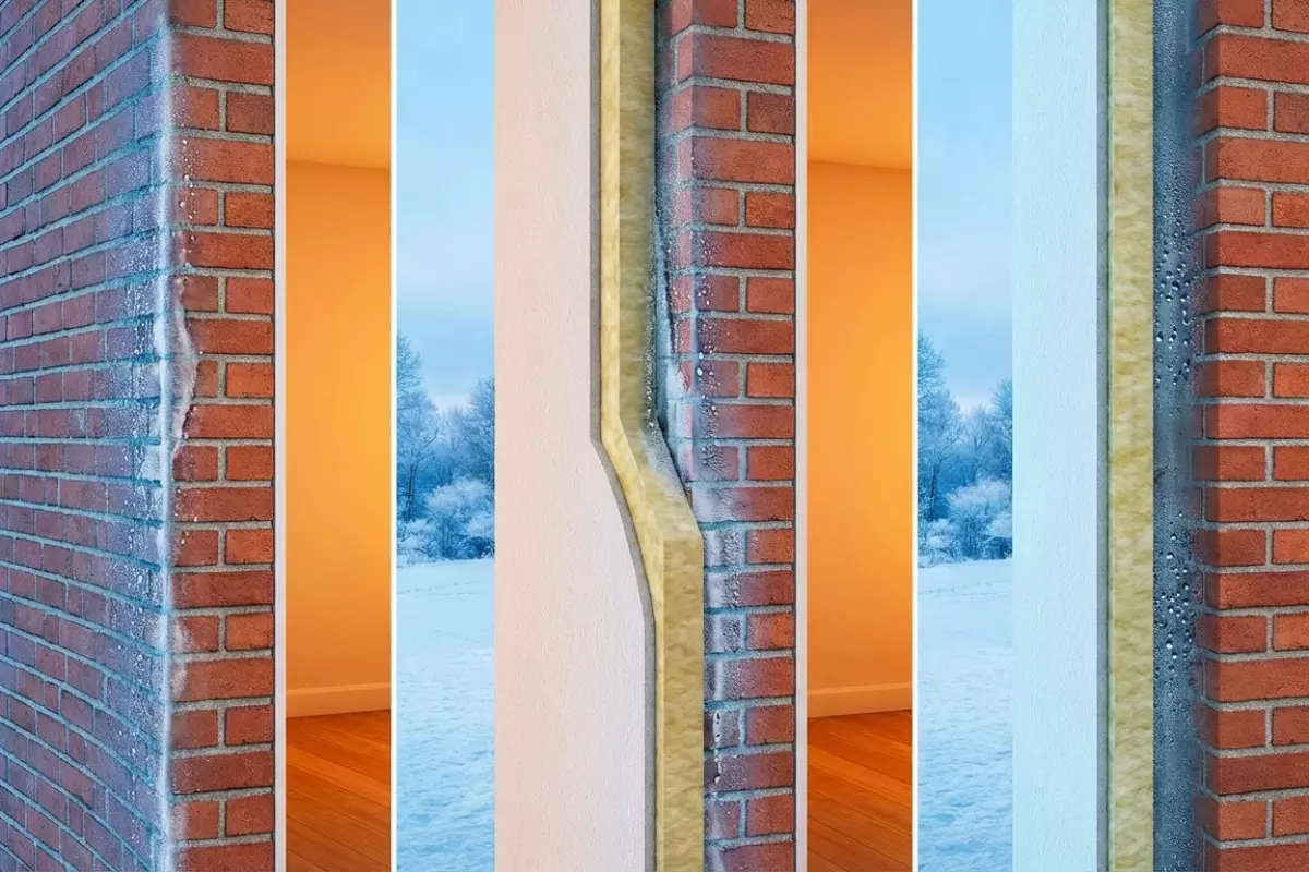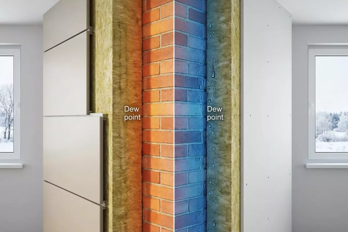 Ключевой момент — где окажется точка росы. При наружном варианте она чаще смещается ближе к внешним слоям, и стена внутри остаётся суше. При внутреннем точка росы может «переехать» к границе утеплителя и основания, а это уже условия для конденсата. Особенно чувствительны углы, откосы, зоны за мебелью и места с неплотной пароизоляцией.