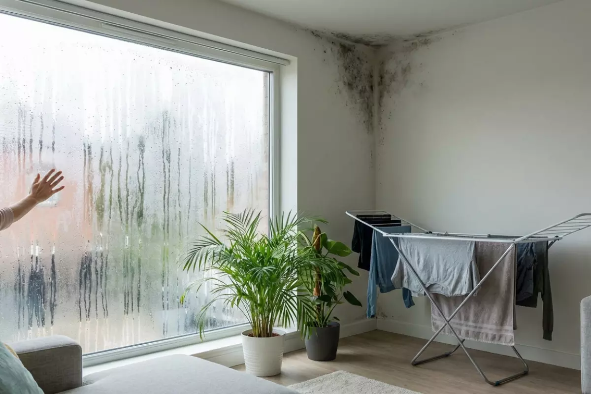 Самый частый сценарий — тёплый влажный воздух упирается в холодные зоны (углы, откосы, места мостиков холода) и там достигает точки росы. В результате сначала запотевают стеклопакеты и зеркала, потом темнеют швы, а дальше может появиться стойкий запах сырости и плесневые пятна.