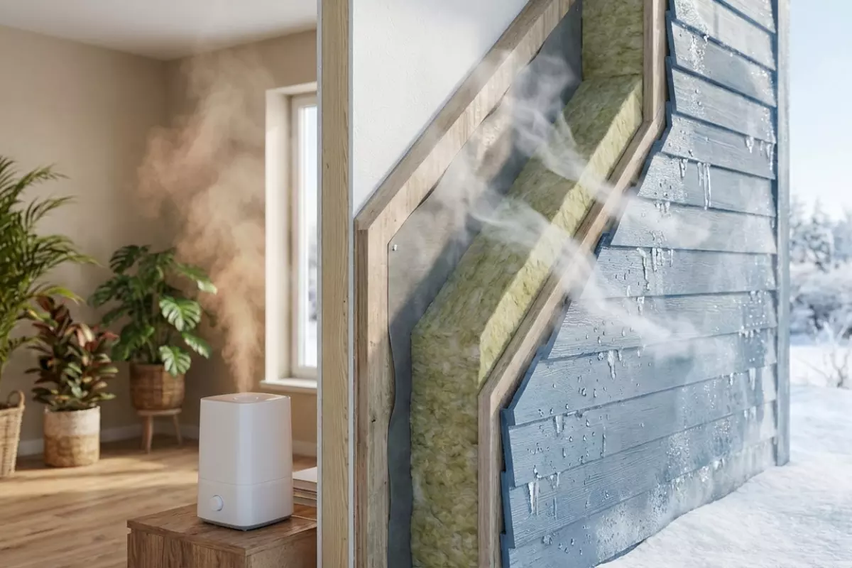 Внутри дома почти всегда теплее и влажнее, чем на улице. Из-за этого водяной пар стремится наружу через щели, стыки и материалы. Если на пути есть холодный участок, пар может перейти в воду — и тогда появляются мокрые зоны, падение тепловой эффективности и риск биопоражений.